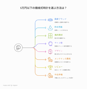 5万円以下の機械式時計を買うときの選び方のコツは、国産ブランド、防水性能、風防素材、サイズ感、デザイン、メンテナンス費用、レビュー、そして中古市場の活用まで、多角的にチェックすることです。特に国産ブランドのエントリーモデルは信頼性が高く、初めて機械式時計を購入する人にとって非常におすすめです。