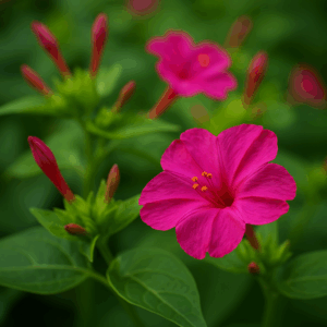 オシロイバナ(英名: Four o’clock flower) – 日中は蕾(つぼみ)のまま閉じていて、夕方4時過ぎになると花開くことで知られます。夕暮れ時に芳香を放ち、夜行性の蛾などを誘う花です。