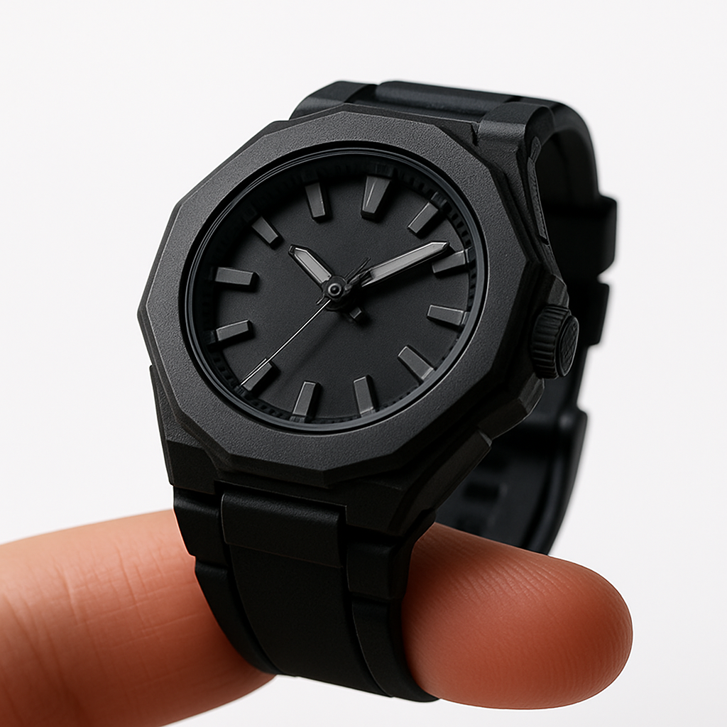 V10Kは素材のインパクトだけでなく、デザイン面でも未来的かつミニマルな魅力を放ちました。ケースは滑らかな長方形フォルムで、傷の付きにくいサファイアクリスタルの風防ガラスと調和した漆黒の光沢を湛えています。金属的な光沢ともセラミックとも異なる、独特の深い輝きはダイヤモンドコーティングならではの質感です。また、ムーブメントには高精度のクォーツを採用しており、実用時計としての使いやすさも備えています。防水性能は日常生活防水程度ですが、そもそも傷のみならず腐食にも強い素材のため、長期間にわたり外装の美しさを保てる点が魅力です。